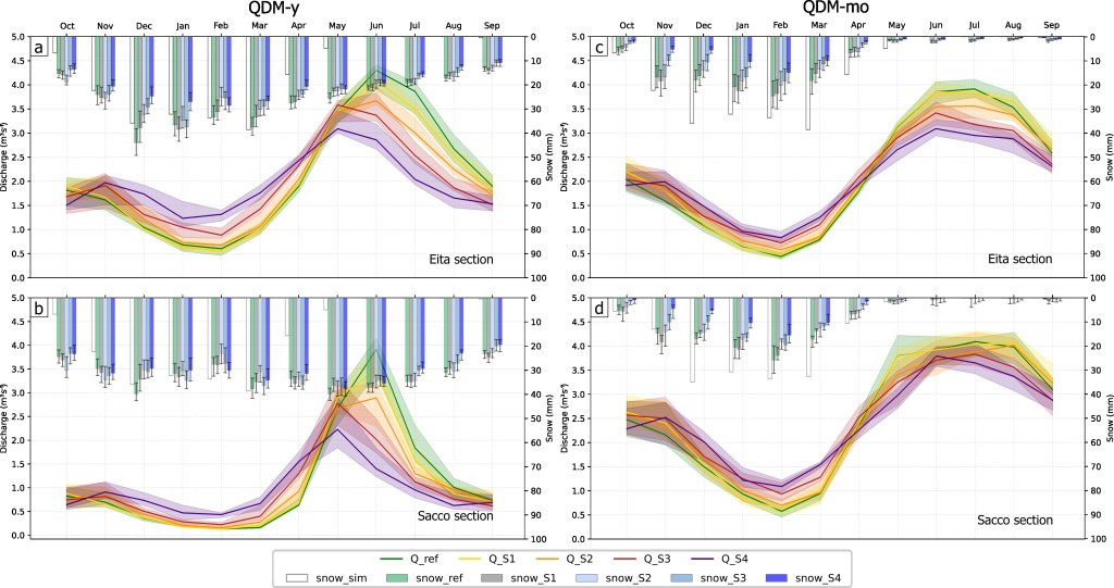 Daily precipitation and temperature from 21 EURO-CORDEX Regional Climate Models (~12.5 km) were bias-corrected against observations (2005–2020). Bias correction and downscaling applied both QDM-y and QDM-mo. Meteorological forcing included blended radar–gauge precipitation (Radar+OK) and kriged temperature fields. The GEOframe hydrological model, calibrated at Eita and Sacco stream gauges, simulated streamflow and GHP. Model performance and bias-correction accuracy were assessed using ETCCDI climate indices, Kling–Gupta Efficiency, and bias metrics.